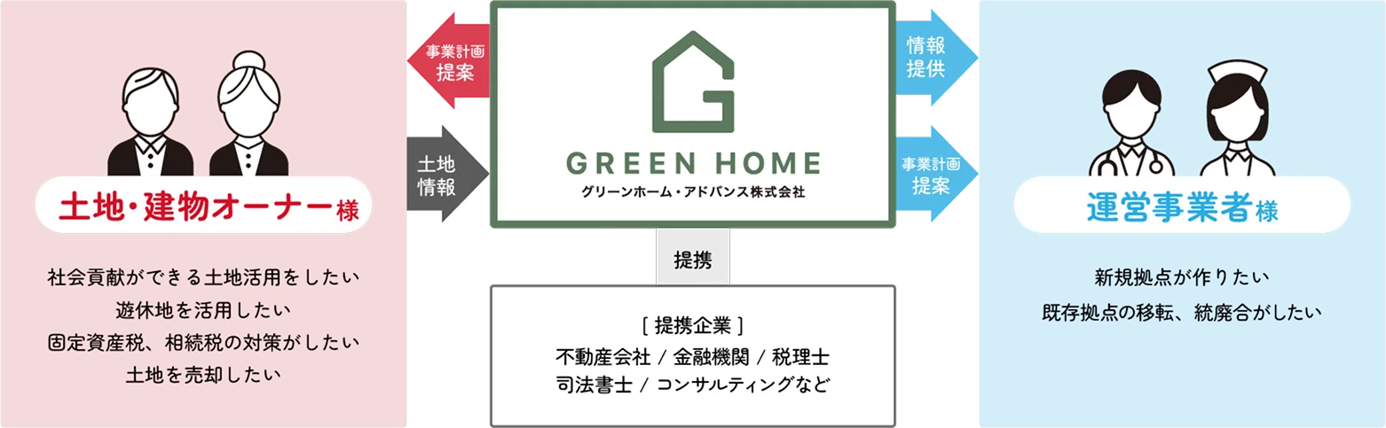 弊社では土地・建物の情報をナーシングホームの運営を行いたい事業者様にご紹介し、土地・建物所有のオーナー様と、運営事業者様とのマッチングを行っています。その際に必要な金融機関や司法書士などと連携し、スムーズに建築、運営が開始できるように総合的にサポート致します。